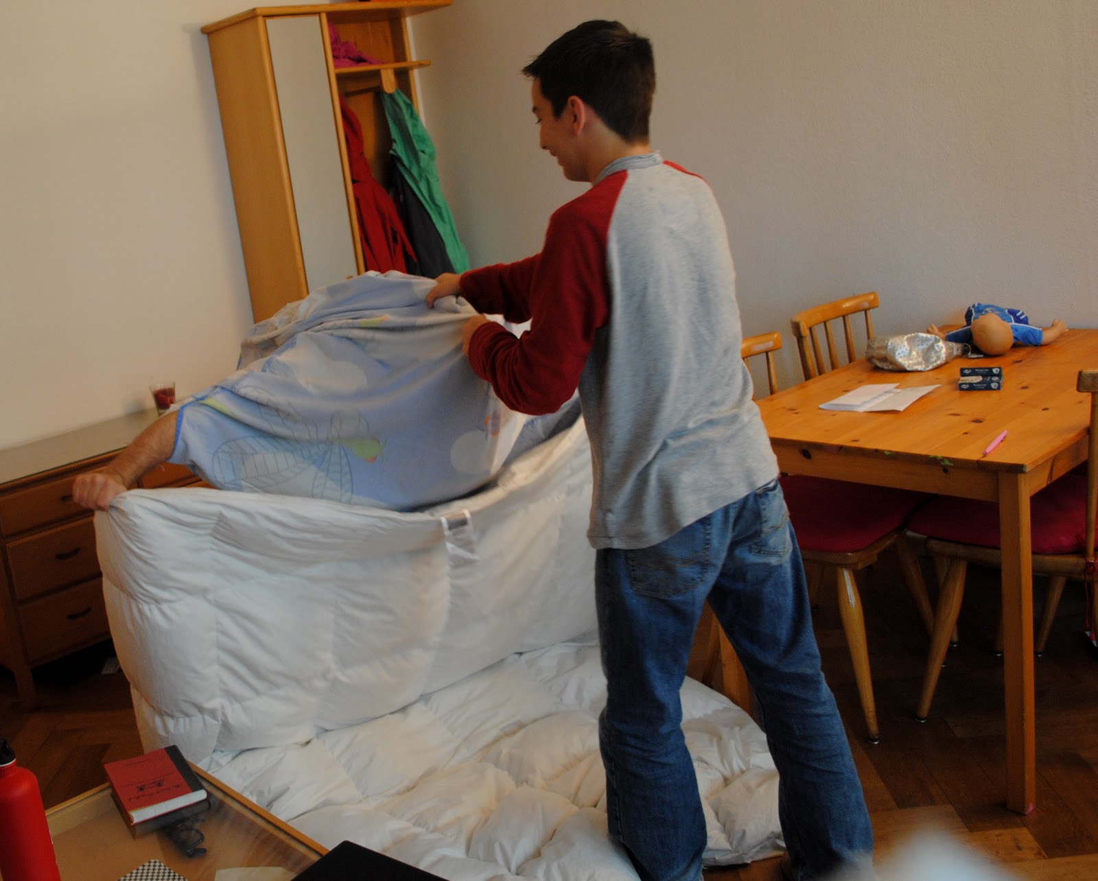 That's right. You've been warned. After washing the sheets, pillow cases, and duvet covers I put the guys in charge of putting them back on the beds. This is how I found them: